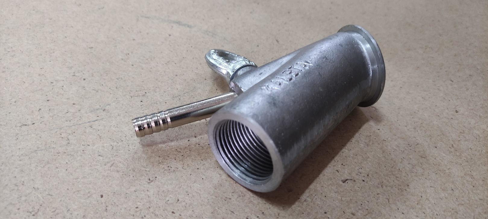 Сделан из алюминия. Состоит из стального винта с ручкой и латунного сопла.